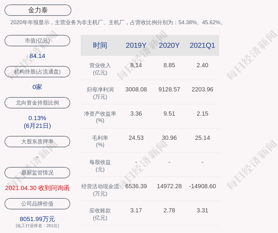 2020年年報顯示,金力泰的主營業務為非主機廠、主機廠,占營收比例分別為:54.38%、45.62%。