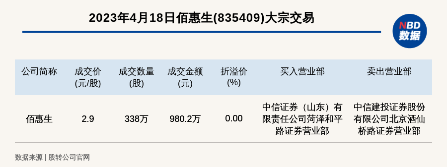 每經訊,2023年4月18日,新三板基礎層公司佰惠生(835409)發生一筆大宗交易,成交價2.9元/股,成交數量338萬股,成交金額980.2萬元,為平價交易。買入營業部是中信證券(山東)有限責任公司菏澤和平路證券營業部,賣出營業部是中信建投證券股份有限公司北京酒仙橋路證券營業部。