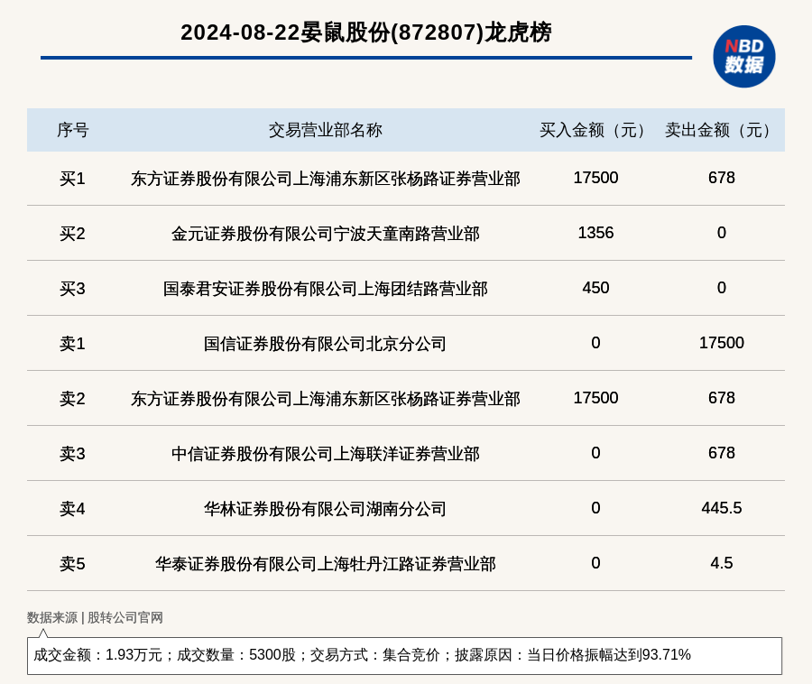 每經訊,2024年8月22日,新三板創新層公司晏鼠股份(872807,收盤價:6.78元)登上龍虎榜,交易方式是集合競價,披露原因是當日價格振幅達到93.71%,成交數量5300股,成交金額1.93萬元。買一席位為東方證券股份有限公司上海浦東新區張楊路證券營業部,買入1.75萬元;賣一席位為國信證券股份有限公司北京分公司,賣出1.75萬元。