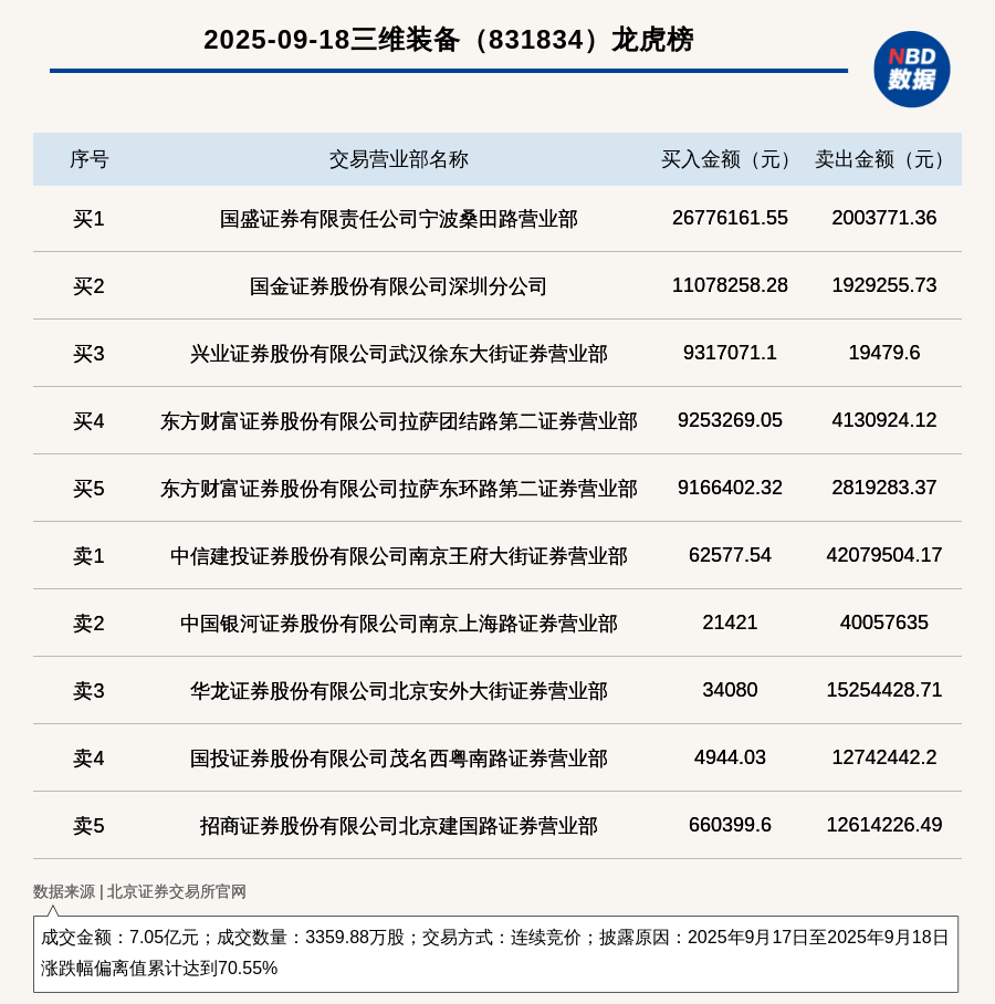 每(mei)經訊,2025年9月18日,北交(jiao)所上市公(gong)(gong)司三維裝備(831834,收盤價:26元)登上龍虎榜,交(jiao)易方式(shi)是(shi)(shi)連續競價,披露原因是(shi)(shi)2025年9月17日至(zhi)2025年9月18日漲(zhang)跌幅偏離值(zhi)累計達到70.55%,成(cheng)交(jiao)數量(liang)3359.88萬股,成(cheng)交(jiao)金(jin)額(e)7.05億元。買一(yi)席位(wei)為國盛(sheng)證券有限(xian)責任公(gong)(gong)司寧波桑田路營(ying)業部(bu),買入2677.62萬元;賣一(yi)席位(wei)為中(zhong)信建(jian)投證券股份有限(xian)公(gong)(gong)司南京王府大(da)街證券營(ying)業部(bu),賣出4207.95萬元。
