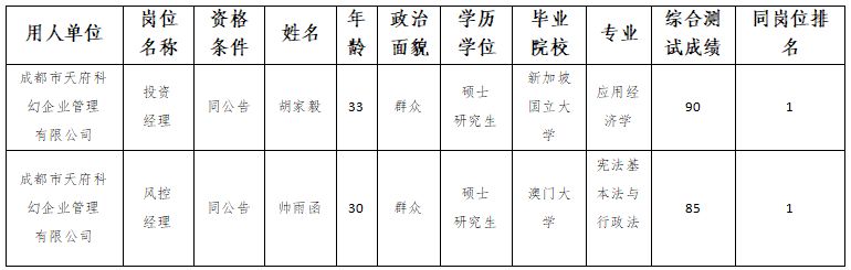 根據我司前期發布的招聘公告以及招聘規定,經資格審核、筆試、一輪面試、復試、背景調查、體檢等程序,擬聘胡家毅為投資經理、帥雨函為風控經理,現將名單予以公示。
