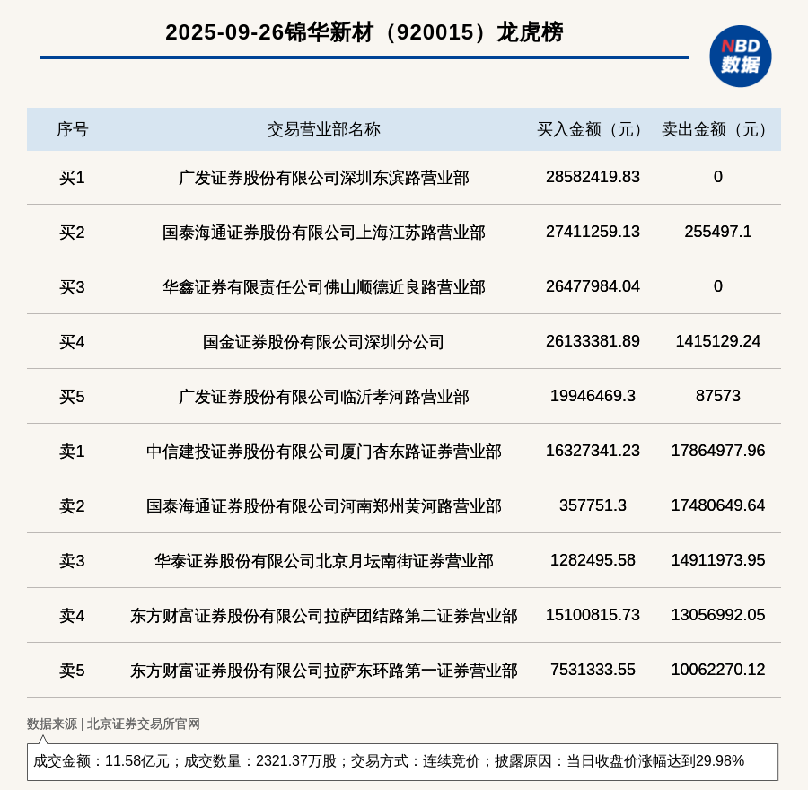 每經訊,2025年9月26日,北(bei)交(jiao)所上(shang)市公司(si)錦華新材(920015,收盤(pan)價:54.97元(yuan))登上(shang)龍虎榜,交(jiao)易方(fang)式是連續競價,披露原因(yin)是當日收盤(pan)價漲幅達到29.98%,成交(jiao)數(shu)量2321.37萬(wan)股,成交(jiao)金額11.58億元(yuan)。買一席(xi)位為廣發證券(quan)股份(fen)有限公司(si)深圳(zhen)東濱路營(ying)業(ye)部,買入2858.24萬(wan)元(yuan);賣(mai)一席(xi)位為中信(xin)建投證券(quan)股份(fen)有限公司(si)廈門杏東路證券(quan)營(ying)業(ye)部,賣(mai)出1786.5萬(wan)元(yuan)。