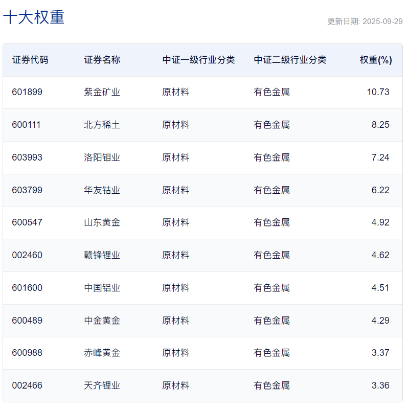 中證有色金屬礦業指數(shu)前十(shi)大(da)成分股