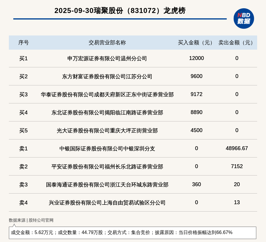 每經訊,2025年9月30日,新(xin)三板基礎層公司(si)(si)瑞聚股份(fen)(831072,收盤價(jia):0.2元(yuan))登上龍虎榜,交易方式是集合競價(jia),披露原因是當日價(jia)格振幅達到(dao)66.67%,成(cheng)交數量(liang)44.79萬(wan)(wan)股,成(cheng)交金額5.62萬(wan)(wan)元(yuan)。買一席位(wei)(wei)為(wei)申萬(wan)(wan)宏源證券有限(xian)公司(si)(si)溫(wen)州(zhou)分公司(si)(si),買入1.2萬(wan)(wan)元(yuan);賣一席位(wei)(wei)為(wei)中(zhong)銀國(guo)際證券股份(fen)有限(xian)公司(si)(si)中(zhong)銀深圳分支,賣出4.9萬(wan)(wan)元(yuan)。