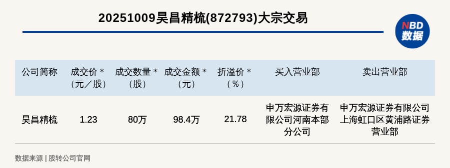 每(mei)經訊,2025年10月9日(ri),新三板基礎(chu)層公(gong)司(si)昊昌精梳(872793,收盤價(jia):1.01元)發生(sheng)一筆大宗交(jiao)(jiao)易(yi),成(cheng)交(jiao)(jiao)價(jia)1.23元/股(gu),成(cheng)交(jiao)(jiao)數量80萬股(gu),成(cheng)交(jiao)(jiao)金額98.4萬元,溢價(jia)21.78%。買入(ru)營(ying)業部是(shi)申(shen)(shen)萬宏源(yuan)證券有(you)限公(gong)司(si)河南(nan)本部分公(gong)司(si),賣(mai)出營(ying)業部是(shi)申(shen)(shen)萬宏源(yuan)證券有(you)限公(gong)司(si)上海虹口區黃浦路(lu)證券營(ying)業部。
