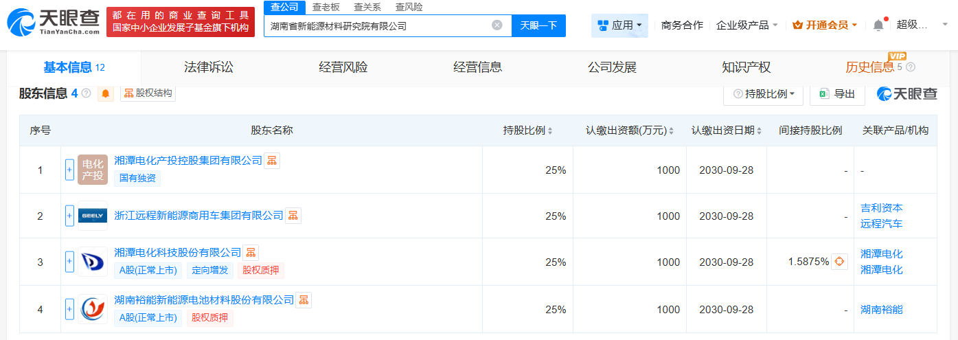 每經AI快訊,天眼查工商信息顯示,近日,湖南省新能源材料研究院有限公司成立,法定代表人為劉干江、注冊資本4000萬元人民幣,經營范圍包括新材料技術研發、新材料技術推廣服務、以自有資金從事投資活動等。股東信息顯示,該公司由湘潭電化(002125)、湖南裕能(301358)、浙江遠程新能源商用車集團有限公司、湘潭電化產投控股集團有限公司共同持股。