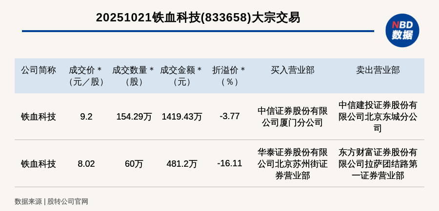 每經訊,2025年10月21日,新三板創新層公司鐵血科技(833658,收盤價:9.56元)發生2筆大宗交易,總成交金額為1900.63萬元,成交金額最高的一筆成交價9.2元/股,成交數量154.29萬股,成交金額1419.43萬元,折價3.77%。買入營業部是中信證券股份有限公司廈門分公司,賣出營業部是中信建投證券股份有限公司北京東城分公司。