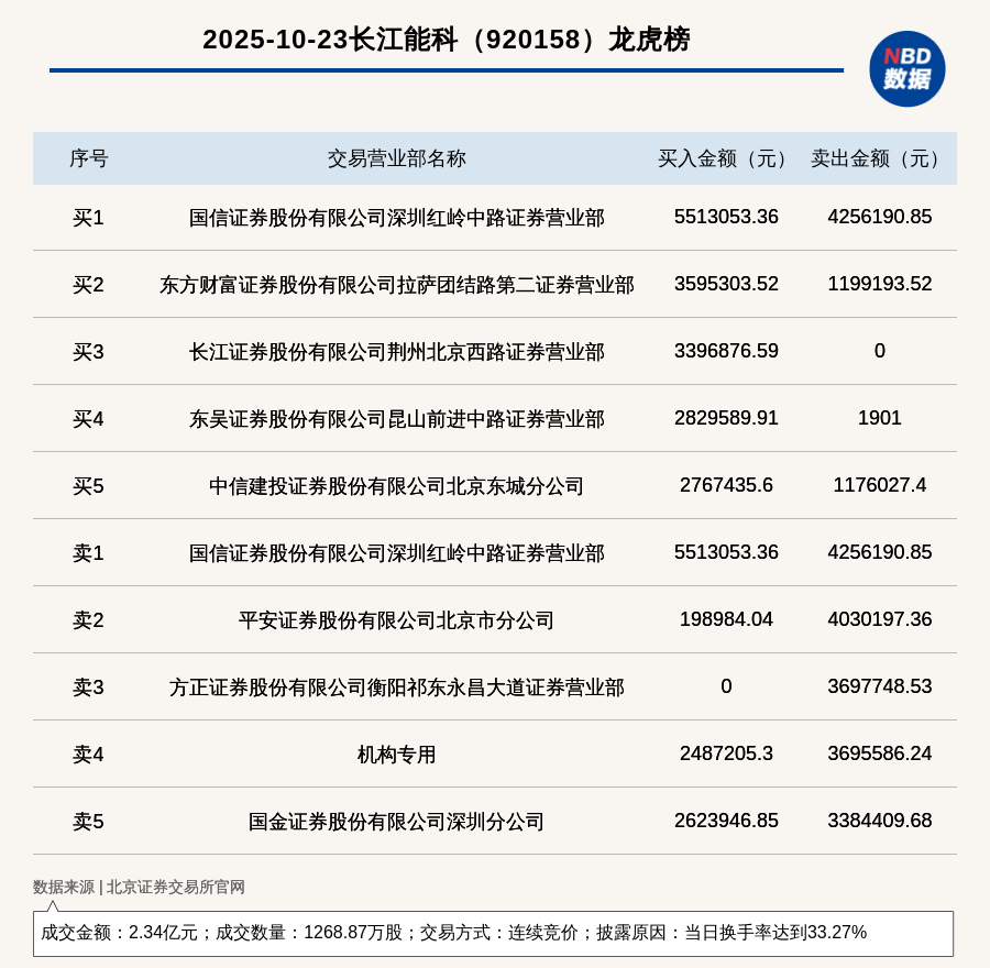 每經訊,2025年10月23日,北交所上市公司長江能科(920158,收盤價:18.89元)登上龍虎榜,交易方式是連續競價,披露原因是當日換手率達到33.27%,成交數量1268.87萬股,成交金額2.34億元。買一席位為國信證券股份有限公司深圳紅嶺中路證券營業部,買入551.31萬元;賣一席位為國信證券股份有限公司深圳紅嶺中路證券營業部,賣出425.62萬元。