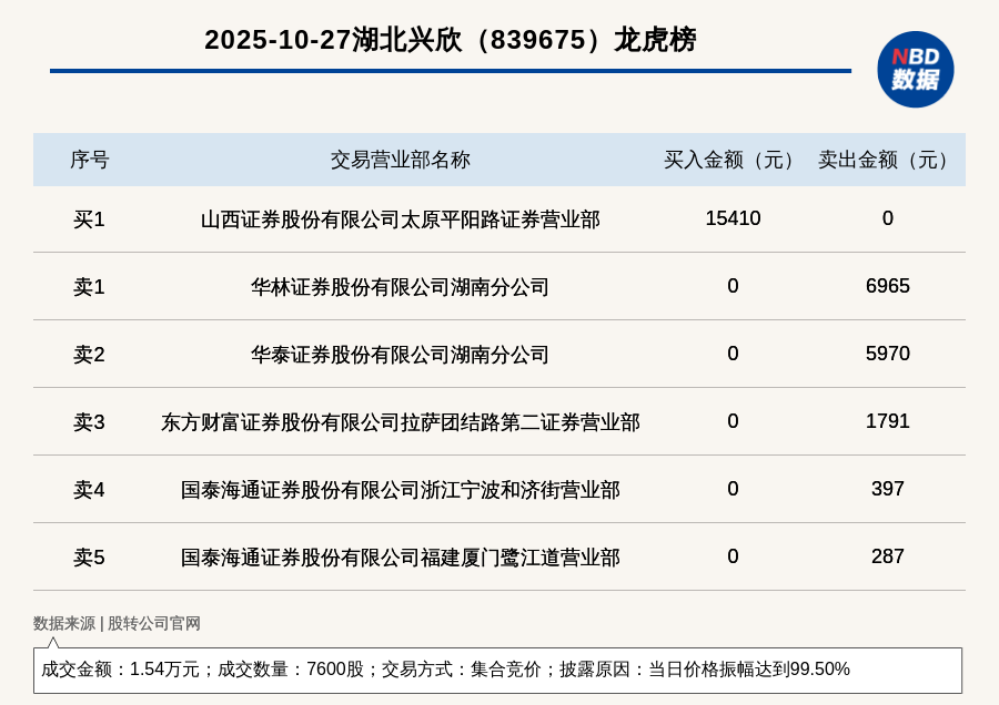 每經訊,2025年10月27日,新三板創新層公司湖北興欣(839675,收盤價:3.97元)登上龍虎榜,交易方式是集合競價,披露原因是當日價格振幅達到99.50%,成交數量7600股,成交金額1.54萬元。買一席位為山西證券股份有限公司太原平陽路證券營業部,買入1.54萬元;賣一席位為華林證券股份有限公司湖南分公司,賣出6965元。