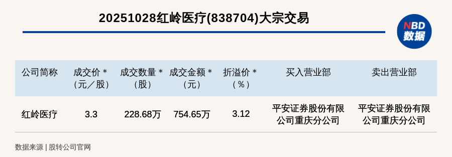 每經訊,2025年10月28日,新三板基礎層公司紅嶺醫療(838704,收盤價:3.2元)發生一筆大宗交易,成交價3.3元/股,成交數量228.68萬股,成交金額754.65萬元,溢價3.12%。買入營業部是平安證券股份有限公司重慶分公司,賣出營業部是平安證券股份有限公司重慶分公司。