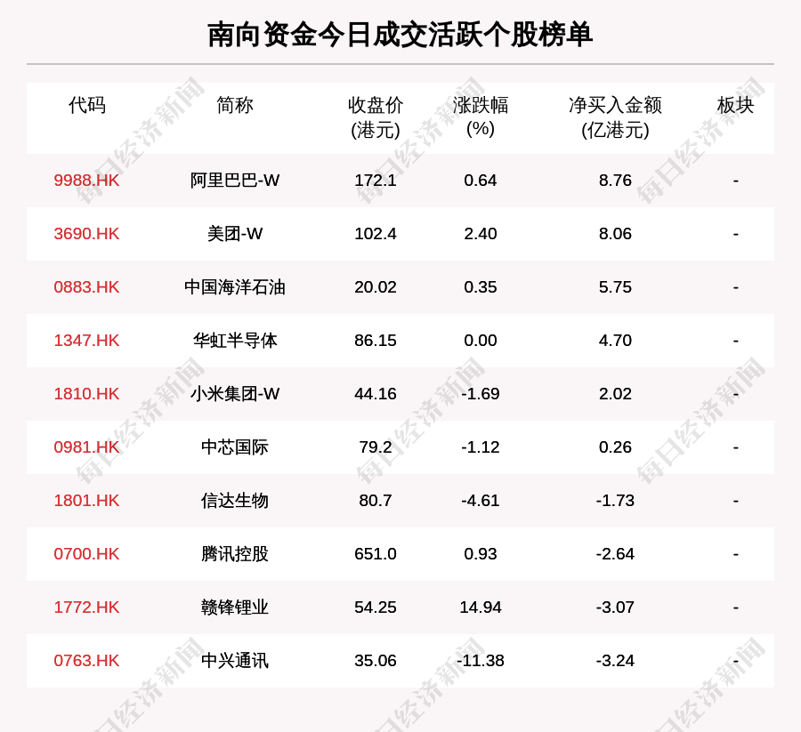 南向資金成交活躍個股榜單中,凈買入個股共6只,金額最多的是阿里巴巴-W(9988.HK,收盤價:172.1港元),凈買入8.756億港元;凈賣出個股共4只,金額最多的是中興通訊(0763.HK,收盤價:35.06港元),凈賣出3.239億港元。