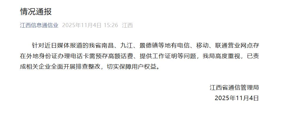 11月4日江西省通信管理局通報,針對南昌、九江等地電信、移動、聯通營業網點外地身份證辦電話卡需預存高額話費、提供工作證明等問題,已責成企業排查整改。媒體調查發現各地執行標準不一,專家稱部分要求合法性存疑,建議監管部門出臺“異地辦卡基本標準”,運營商應分風險等級審查,簡化普通用戶流程。