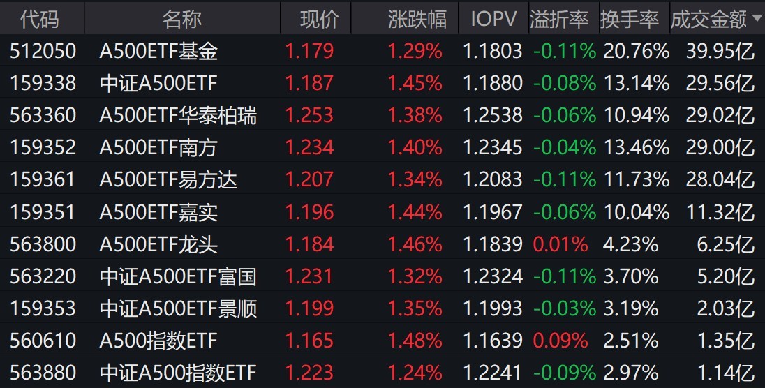 截至上午收盤,場內跟蹤中證A500指數的ETF漲超1%。其中,有11只中證A500相關ETF成交額超1億元,3只超29億元。A500ETF基金、中證A500ETF、A500ETF華泰柏瑞早盤成交額分別為39.95億元、29.56億元、29.02億元。