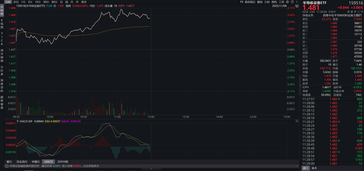 11月6日,聚焦上游半導體設備領域的半導體設備ETF(159516)大漲超3%。資金持續搶籌,半導體設備ETF(159516)年初以來份額增長近200%,當前規模超70億元,居同類產品第一。