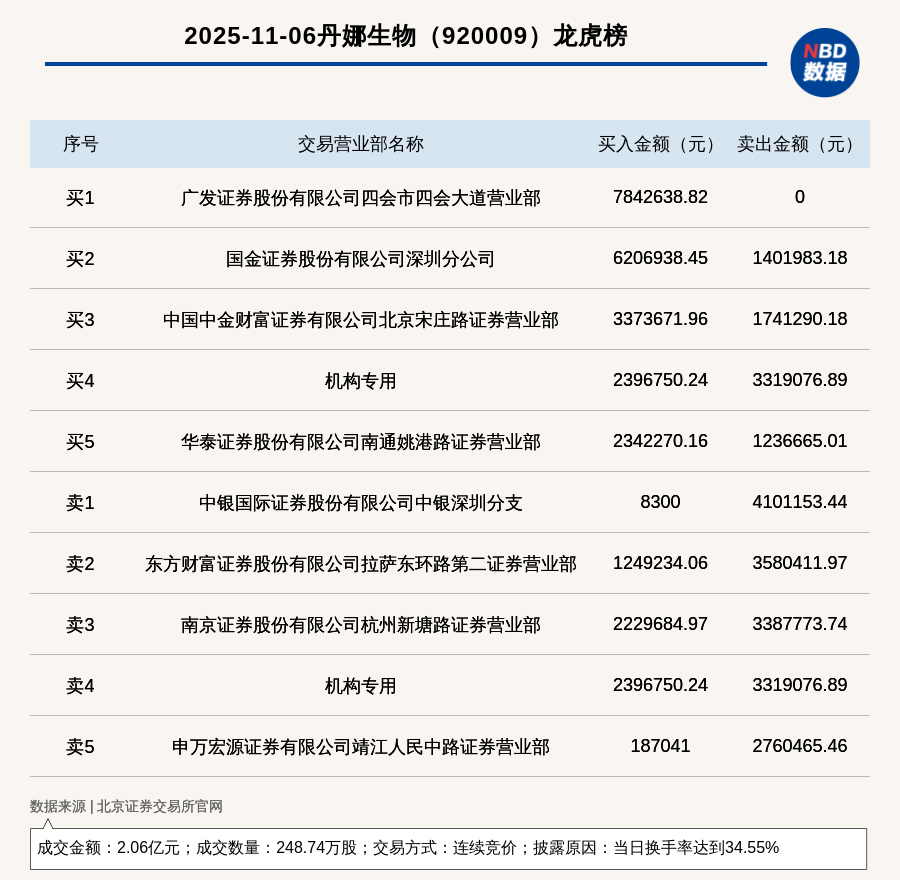 每經訊,2025年11月6日,北交所上市公司丹娜生物(920009,收盤價:83.5元)登上龍虎榜,交易方式是連續競價,披露原因是當日換手率達到34.55%,成交數量248.74萬股,成交金額2.06億元。買一席位為廣發證券股份有限公司四會市四會大道營業部,買入784.26萬元;賣一席位為中銀國際證券股份有限公司中銀深圳分支,賣出410.12萬元。