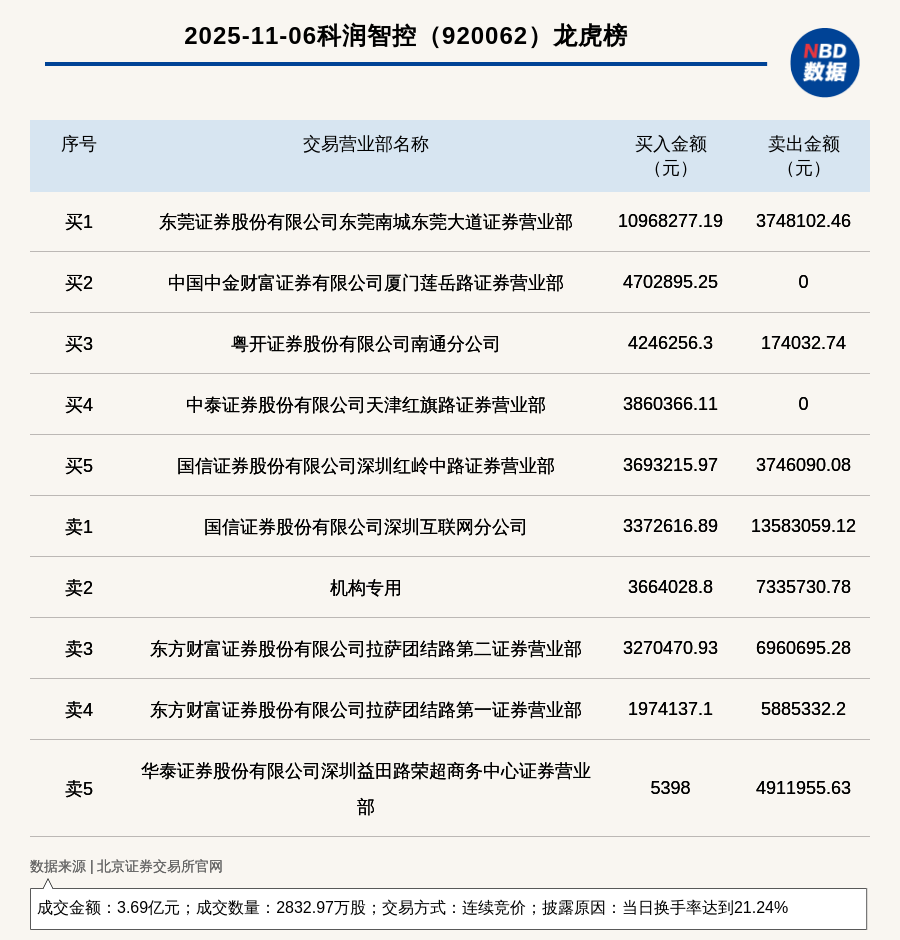 每經訊,2025年11月6日,北交所上市公司科潤智控(920062,收盤價:12.66元)登上龍虎榜,交易方式是連續競價,披露原因是當日換手率達到21.24%,成交數量2832.97萬股,成交金額3.69億元。買一席位為東莞證券股份有限公司東莞南城東莞大道證券營業部,買入1096.83萬元;賣一席位為國信證券股份有限公司深圳互聯網分公司,賣出1358.31萬元。