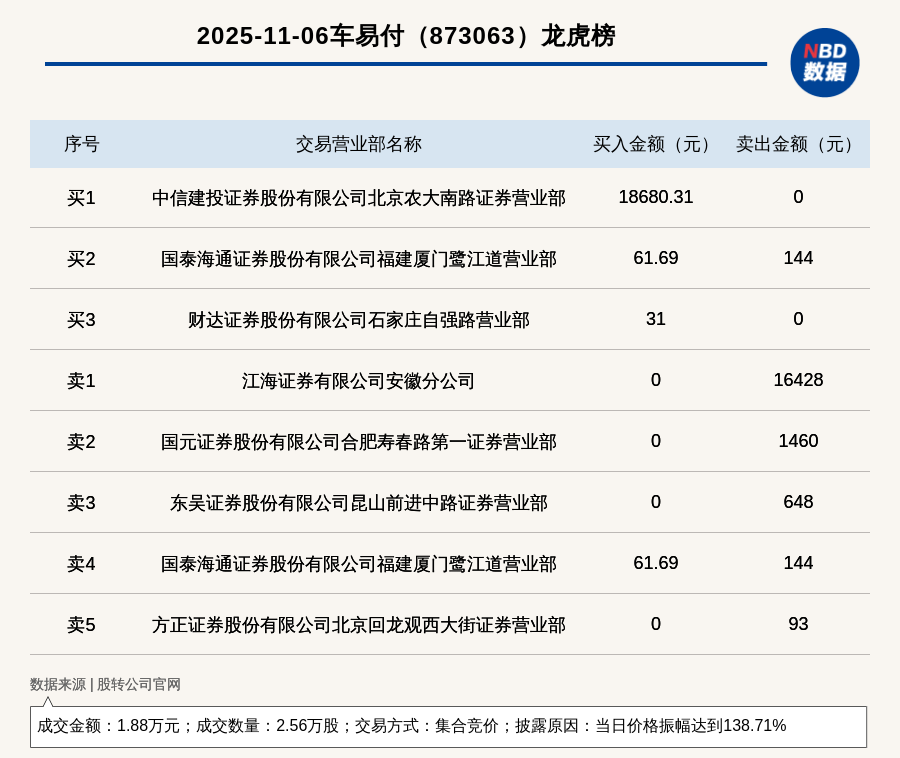 每經訊,2025年11月6日,新三板基礎層公司車易付(873063,收盤價:0.74元)登上龍虎榜,交易方式是集合競價,披露原因是當日價格振幅達到138.71%,成交數量2.56萬股,成交金額1.88萬元。買一席位為中信建投證券股份有限公司北京農大南路證券營業部,買入1.87萬元;賣一席位為江海證券有限公司安徽分公司,賣出1.64萬元。