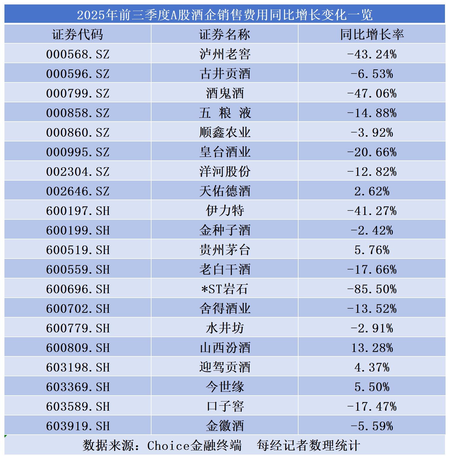 具體來看,*ST巖石銷售費用同比降幅最大,達85%;頭部酒企中,瀘州老窖降幅領跑,同比下滑43.24%,五糧液、洋河股份、古井貢酒則分別同比下滑14.88%、12.82%、6.53%,降本力度尤為明顯。