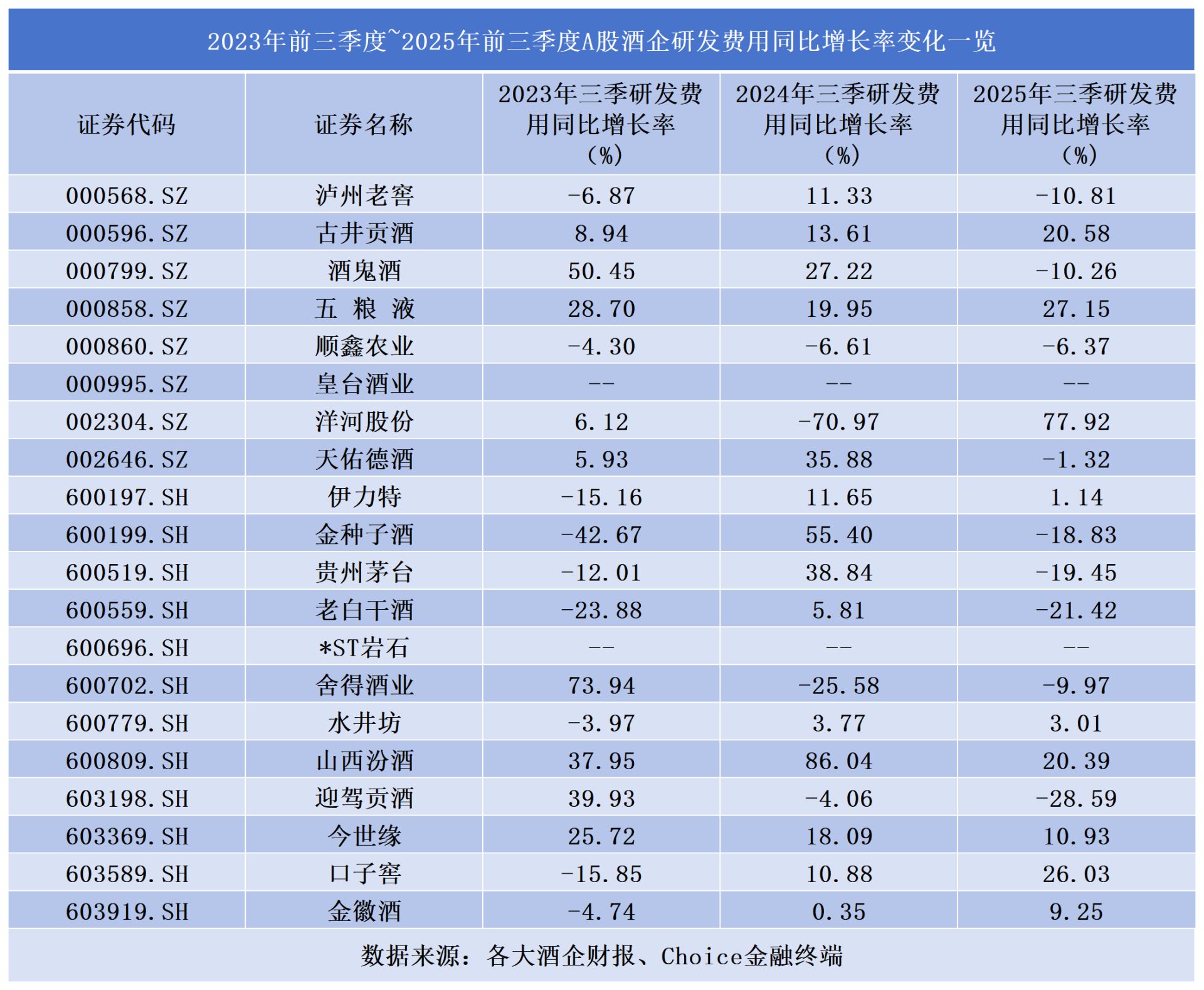 此外,2023年前三季度~2025年前三季度,18家A股酒企中,研發費用同比正增長的企業分別為9家、14家、9家。而今年前三季度,洋河股份、五糧液、古井貢酒、山西汾酒等均實現超20%的同比增長。