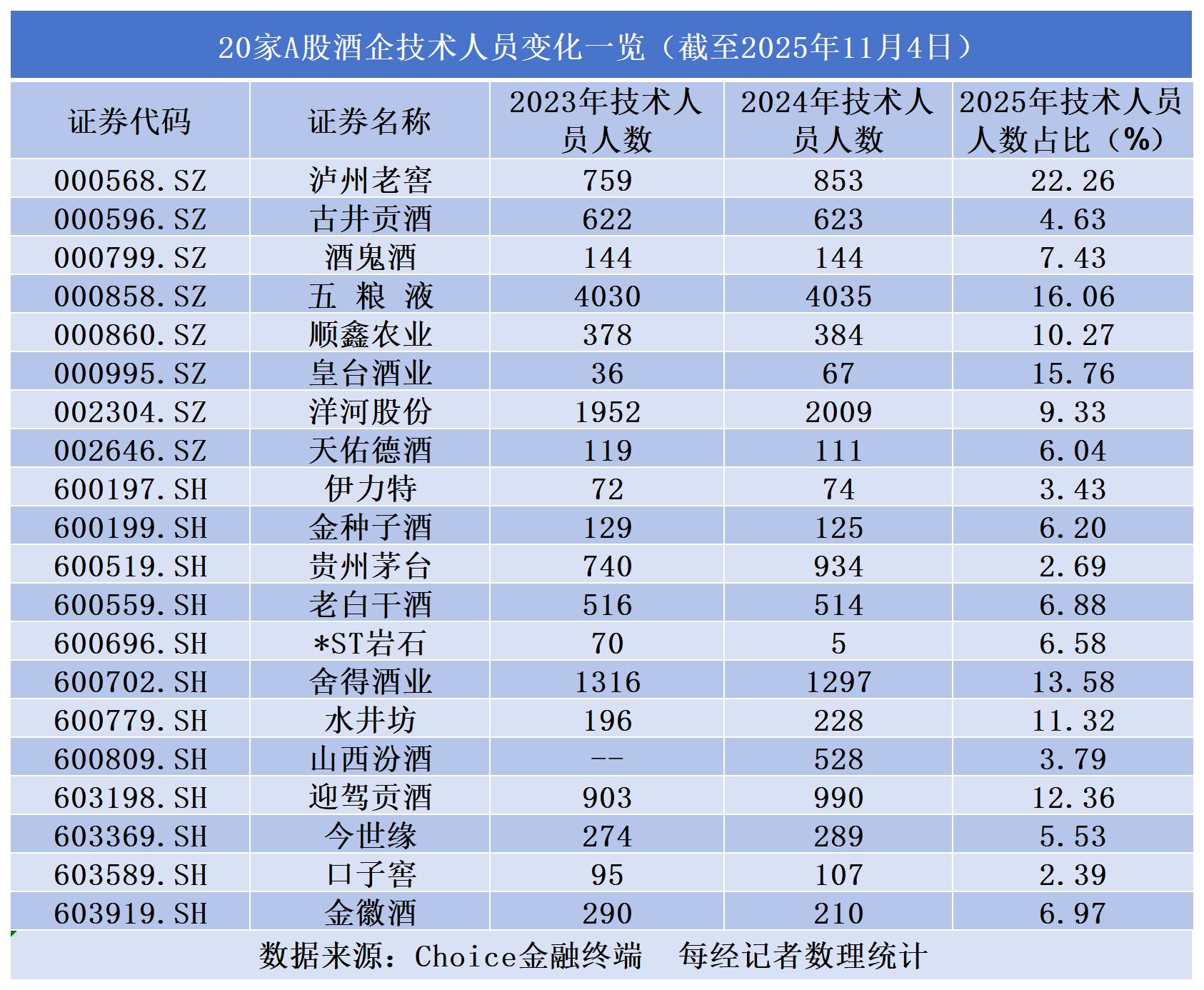 據《每日經濟新聞·將進酒》記者不完全統計,2024年有超六成的酒企技術人員同比實現增長。其中,五糧液、洋河股份、舍得酒業的技術人員分別達到4035人、2009人、1297人。截至2025年11月,20家A股酒企中有7家酒企技術人員占比超10%,而瀘州老窖技術人員占比超20%,五糧液技術人員占比超15%。