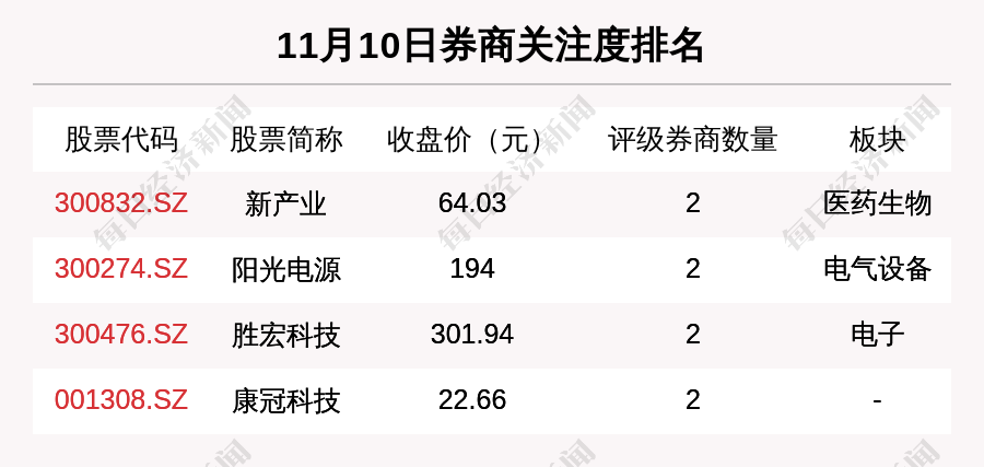 從券商對個股的關注程度來看,有4只個股獲得多家券商關注,券商關注數量排名居前的個股是新產業(300832.SZ)、陽光電源(300274.SZ)、勝宏科技(300476.SZ)。