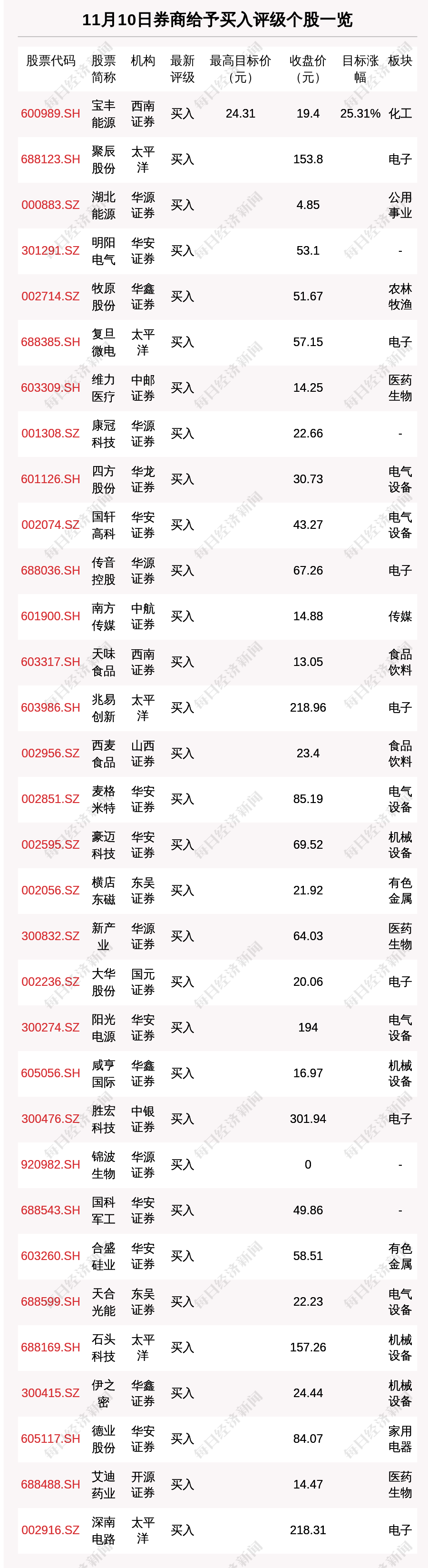 每經AI快訊,11月10日,券商給予評級的個股數共有68只,獲得買入評級的個股數共有32只。在公布了目標價格的1只個股中,按照最新收盤價計算,預期漲幅排名居前的個股是寶豐能源(600989.SH),預期漲幅是25.31%。