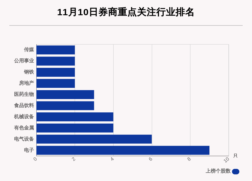 從券商對行業的關注度來看,券商關注個股數居前的行業分別是電子、電氣設備、有色金屬。