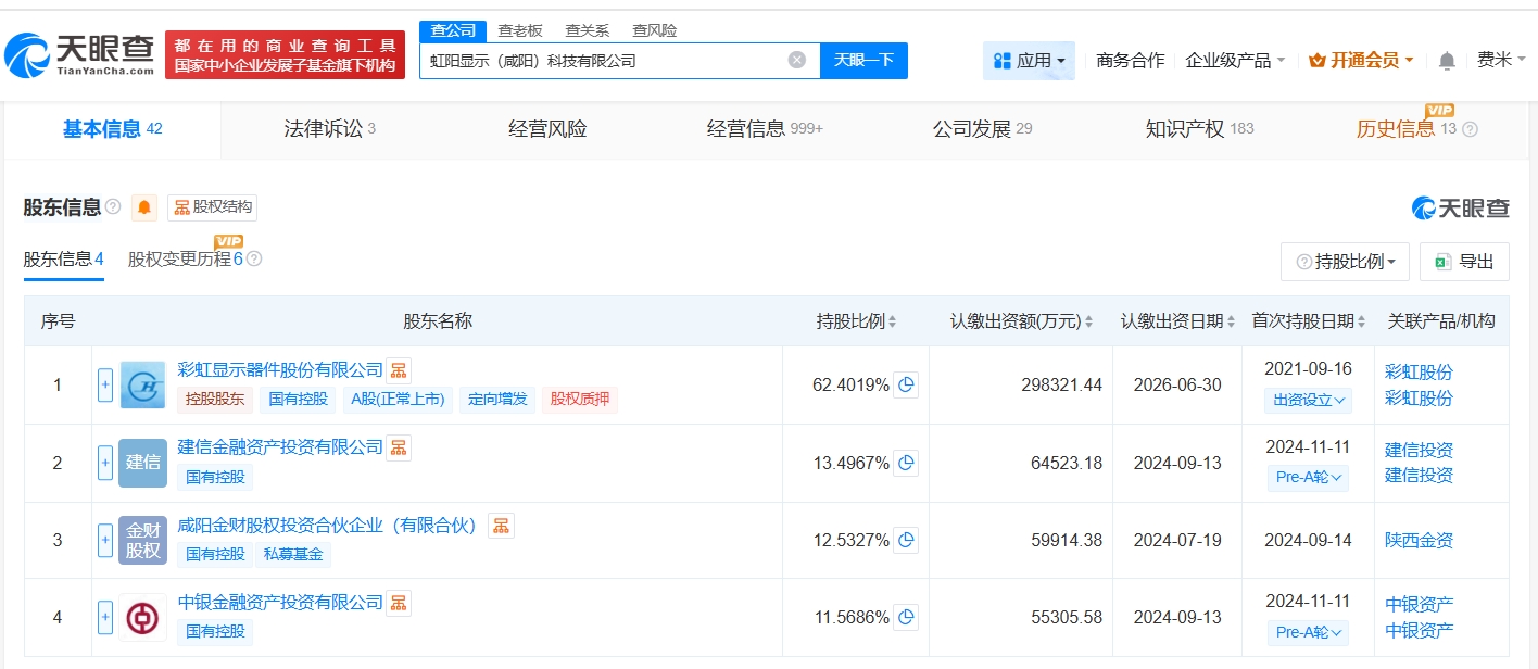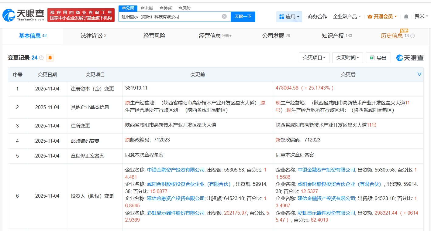 每經AI快訊,天眼查工商信息顯示,近日,虹陽顯示(咸陽)科技有限公司發生工商變更,注冊資本由約38.2億元人民幣增至約47.8億元人民幣,增幅約25%。虹陽顯示(咸陽)科技有限公司成立于2021年9月,法定代表人為劉琎,經營范圍包括玻璃制造、非金屬礦及制品銷售、智能基礎制造裝備制造等。股東信息顯示,該公司由彩虹股份(600707)、建信金融資產投資有限公司、咸陽金財股權投資合伙企業(有限合伙)、中銀金融資產投資有限公司共同持股。