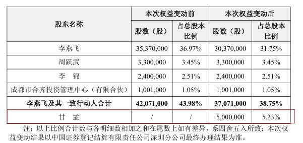 這次股份轉讓后,李燕飛及一致行動人持股比例降低至38.75%;甘孟在交易前未持有公司股份,協議轉讓后,持股占比為5.23%。