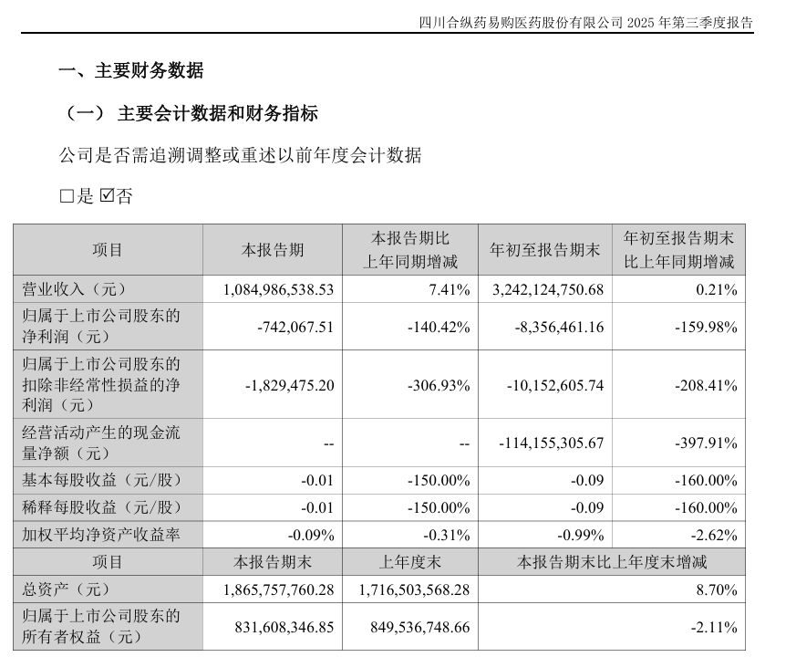 值得注意的是,甘孟在前文中提到的現金流,體現在藥易購身上卻并不樂觀。2025年半年報顯示,藥易購經營活動產生的現金流量凈額為-727.50萬元,而2024年同期為337.68萬元;2025年年初至三季報期末,該數據為-1.14億元,同樣由正轉負。