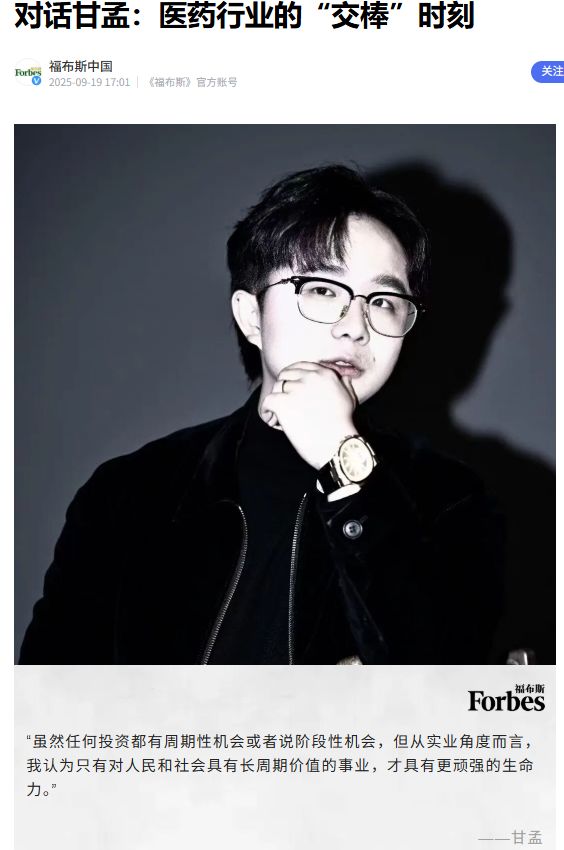 公開信息顯示,甘孟的身份更偏向一名醫藥產業的投資人。一篇由《福布斯中國》發布的文章顯示,甘孟參與創辦值的醫療時,就是以投資人身份下場。在這篇文章中,甘孟表示,持續穩定的現金流是其關注的終極指標。