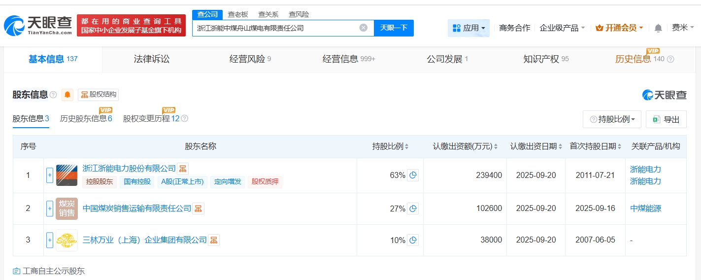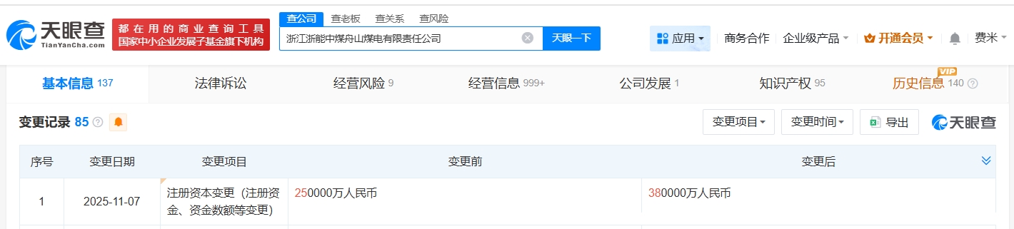 每經AI快訊,天眼查工商信息顯示,近日,浙江浙能中煤舟山煤電有限責任公司發生工商變更,注冊資本由25億元人民幣增至38億元人民幣,增幅52%。該公司成立于2007年6月,法定代表人為朱青國,經營范圍包括城市基礎設施類項目的開發建設和運營、配電網建設與經營等。股東信息顯示,該公司由浙能電力(600023)、中國煤炭銷售運輸有限責任公司、三林萬業(上海)企業集團有限公司共同持股。