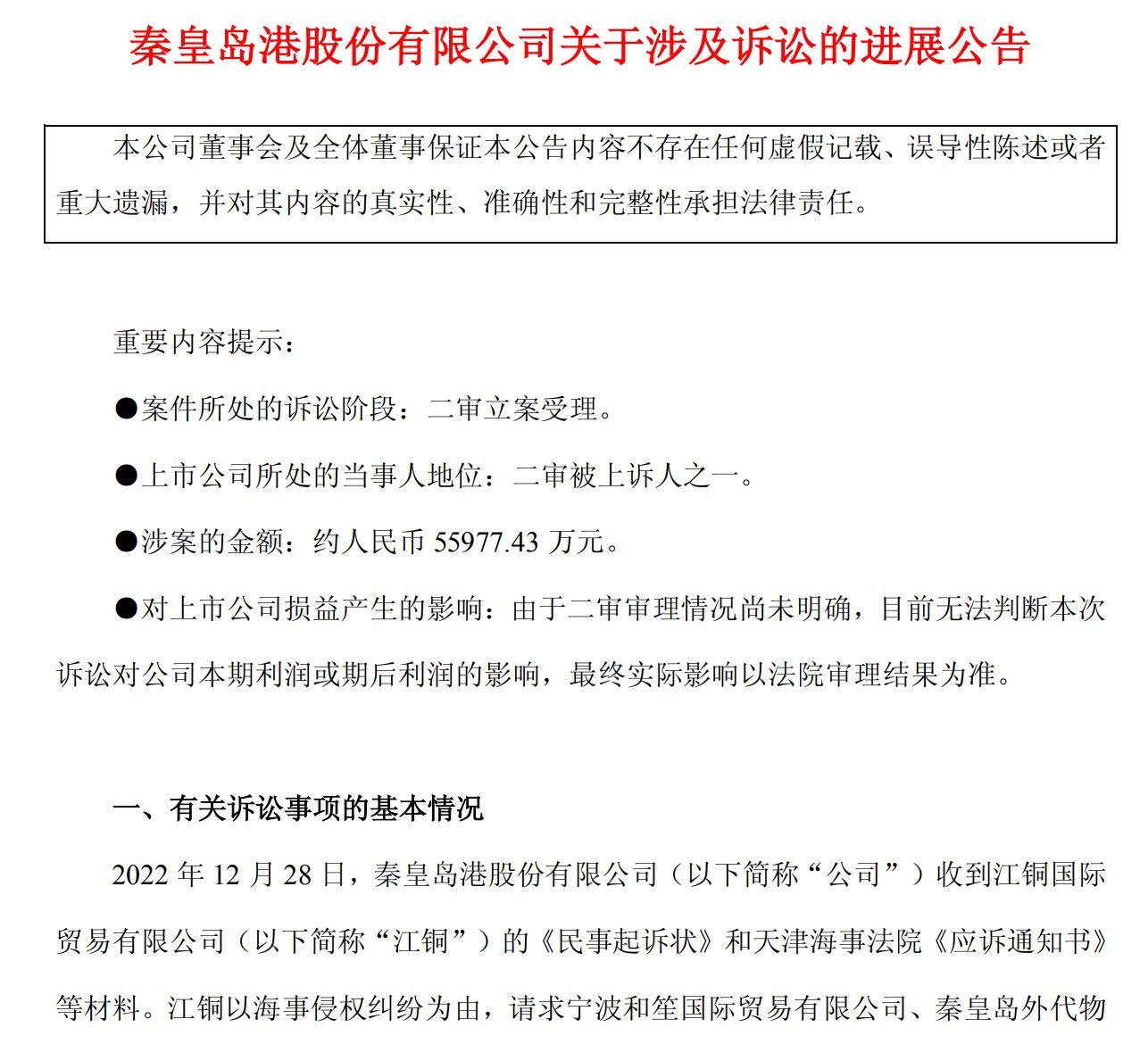 11月12日晚間,秦港股份發布最新訴訟進展公告稱,江銅國際貿易有限公司(以下簡稱“江銅公司”)近日向天津市高級人民法院提起上訴,并獲得法院立案,案件涉及金額約為5.6億元。由于二審審理情況尚未明確,秦港股份目前無法判斷本次訴訟對公司本期利潤或期后利潤的影響。