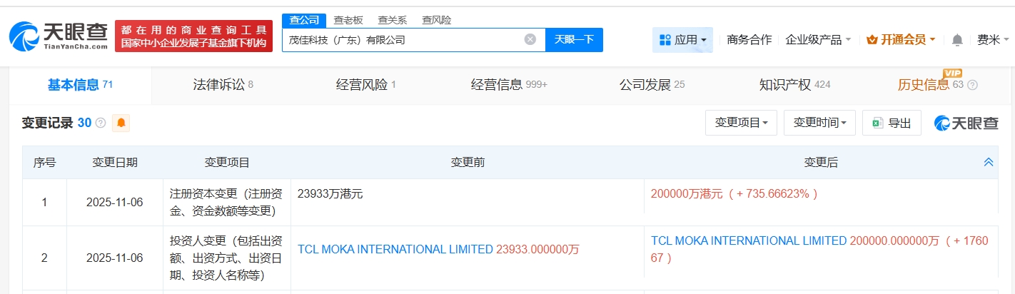 每經AI快訊,天眼查工商信息顯示,近日,茂佳科技(廣東)有限公司發生工商變更,注冊資本由約2.4億港元增至20億港元,增幅約736%。該公司成立于2003年6月,法定代表人為梁鐵民,經營范圍包括研究、開發、生產、銷售數字電子類產品、通訊設備及相關配套的注塑零部件等。股東信息顯示,該公司由TCLMOKAINTERNATIONALLIMITED全資持股。