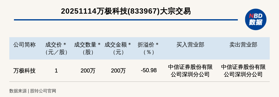 每經訊,2025年11月14日,新三板創新層公司萬極科技(833967,收盤價:2.04元)發生一筆大宗交易,成交價1元/股,成交數量200萬股,成交金額200萬元,折價50.98%。買入營業部是中信證券股份有限公司深圳分公司,賣出營業部是中信證券股份有限公司深圳分公司。