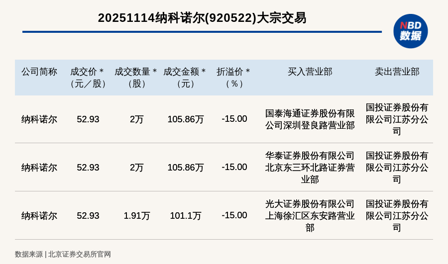 每經訊,2025年11月14日,北交所上市公司納科諾爾(920522,收盤價:62.27元)發生3筆大宗交易,總成交金額為312.82萬元,成交金額最高的一筆成交價52.93元/股,成交數量2萬股,成交金額105.86萬元,折價15%。買入營業部是國泰海通證券股份有限公司深圳登良路營業部,賣出營業部是國投證券股份有限公司江蘇分公司。