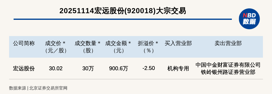 每經訊,2025年11月14日,北交所上市公司宏遠股份(920018,收盤價:30.79元)發生一筆大宗交易,成交價30.02元/股,成交數量30萬股,成交金額900.6萬元,折價2.5%。買入營業部是機構專用,賣出營業部是中國中金財富證券有限公司鐵嶺銀州路證券營業部。