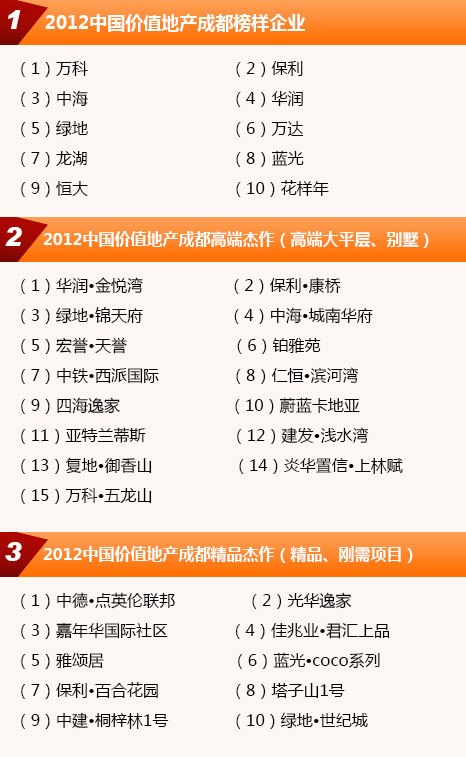 2011年12月,《成都(dou)商報》聯合(he)《每(mei)日經濟新聞》推出“2012中(zhong)(zhong)國價(jia)值地產(chan)成都(dou)榜”暨“2012中(zhong)(zhong)國價(jia)值地產(chan)成都(dou)年會”。