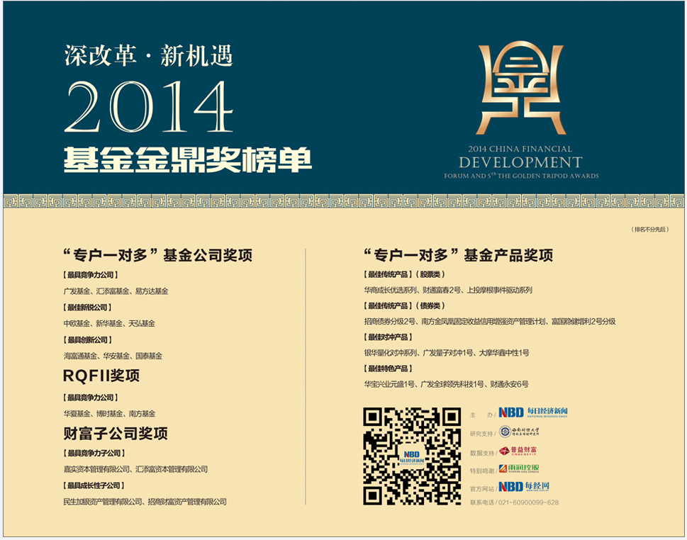 “金(jin)(jin)鼎獎(jiang)” 作(zuo)為《每日(ri)經(jing)(jing)濟(ji)新聞》全力打造(zao)的(de)(de)(de)核心品(pin)牌活動之一,已經(jing)(jing)成功舉辦四屆(jie),其(qi)憑(ping)借專業、權威(wei)(wei)的(de)(de)(de)評選標準得到了社會各界的(de)(de)(de)廣泛 關注與認可(ke),成為冬季中(zhong)國(guo)金(jin)(jin)融行業最受矚目的(de)(de)(de)大事記。今年,《每日(ri)經(jing)(jing)濟(ji)新聞》繼(ji)續聯(lian)合權威(wei)(wei)學(xue)(xue)術單(dan)位,運用科學(xue)(xue)的(de)(de)(de)模型和研究方法,為 中(zhong)國(guo)高端(duan)投資者提供一份(fen)公正(zheng)、權威(wei)(wei)的(de)(de)(de)金(jin)(jin)融產品(pin)、品(pin)牌和團隊機構的(de)(de)(de)榜(bang)單(dan)。
